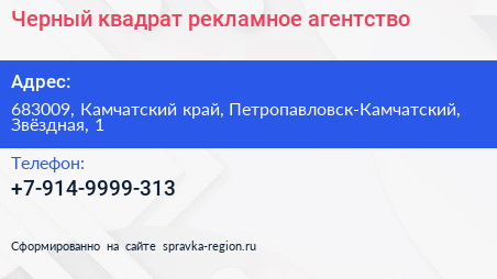 Черный квадрат, рекламное агентство по адресу 683009, Камчатский край, Петропавловск-Камчатский, Звёздная, 1 в дальнейшем Организация, размещена в следующих категориях: