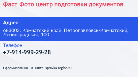 Фаст Фото, центр подготовки документов по адресу 683003, Камчатский край, Петропавловск-Камчатский, Ленинградская, 100 в дальнейшем Организация, размещена в следующих категориях: