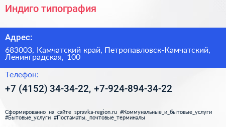 Индиго, типография по адресу 683003, Камчатский край, Петропавловск-Камчатский, Ленинградская, 100 в дальнейшем Организация, размещена в следующих категориях: