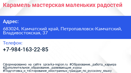 Карамель, мастерская маленьких радостей по адресу 683024, Камчатский край, Петропавловск-Камчатский, Владивостокская, 37 в дальнейшем Организация, размещена в следующих категориях: