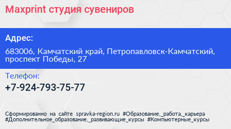 Maxprint, студия сувениров по адресу 683006, Камчатский край, Петропавловск-Камчатский, проспект Победы, 27 в дальнейшем Организация, размещена в следующих категориях: