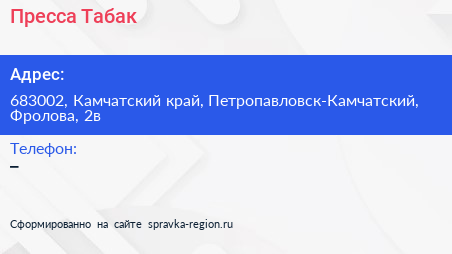 Пресса-Табак по адресу 683002, Камчатский край, Петропавловск-Камчатский, Фролова, 2в в дальнейшем Организация, размещена в следующих категориях: