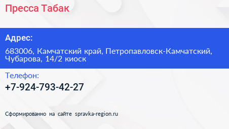 Пресса-Табак по адресу 683006, Камчатский край, Петропавловск-Камчатский, Чубарова, 14/2 киоск в дальнейшем Организация, размещена в следующих категориях: