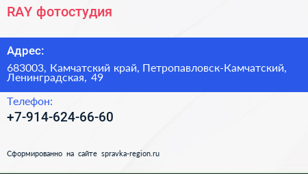 RAY, фотостудия по адресу 683003, Камчатский край, Петропавловск-Камчатский, Ленинградская, 49 в дальнейшем Организация, размещена в следующих категориях: