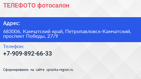 ТЕЛЕФОТО, фотосалон по адресу 683006, Камчатский край, Петропавловск-Камчатский, проспект Победы, 27/9 в дальнейшем Организация, размещена в следующих категориях:
