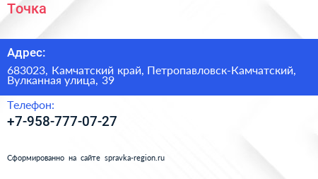 Точка по адресу 683023, Камчатский край, Петропавловск-Камчатский, Вулканная улица, 39 в дальнейшем Организация, размещена в следующих категориях:
