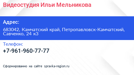 Видеостудия Ильи Мельникова по адресу 683042, Камчатский край, Петропавловск-Камчатский, Савченко, 24 к3 в дальнейшем Организация, размещена в следующих категориях: