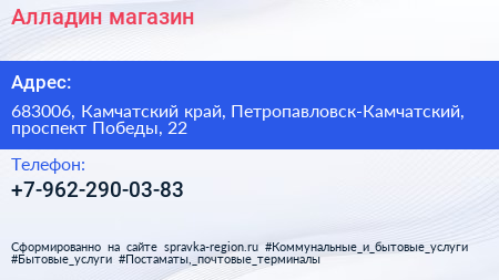 Алладин, магазин по адресу 683006, Камчатский край, Петропавловск-Камчатский, проспект Победы, 22 в дальнейшем Организация, размещена в следующих категориях: