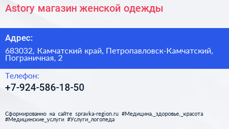Astory, магазин женской одежды по адресу 683032, Камчатский край, Петропавловск-Камчатский, Пограничная, 2 в дальнейшем Организация, размещена в следующих категориях: