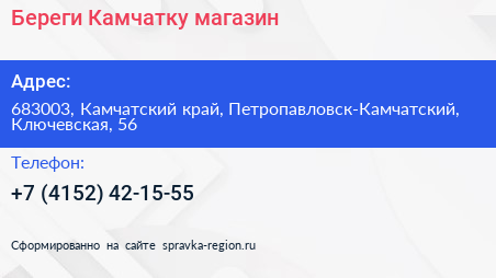 Береги Камчатку, магазин по адресу 683003, Камчатский край, Петропавловск-Камчатский, Ключевская, 56 в дальнейшем Организация, размещена в следующих категориях: