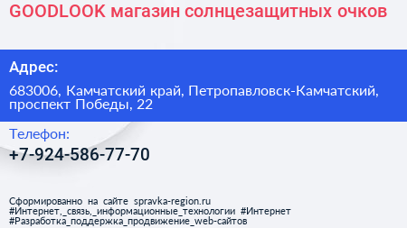 GOODLOOK, магазин солнцезащитных очков по адресу 683006, Камчатский край, Петропавловск-Камчатский, проспект Победы, 22 в дальнейшем Организация, размещена в следующих категориях: