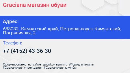 Graciana, магазин обуви по адресу 683032, Камчатский край, Петропавловск-Камчатский, Пограничная, 2 в дальнейшем Организация, размещена в следующих категориях: