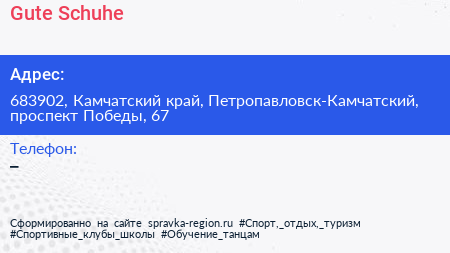 Gute Schuhe по адресу 683902, Камчатский край, Петропавловск-Камчатский, проспект Победы, 67 в дальнейшем Организация, размещена в следующих категориях:
