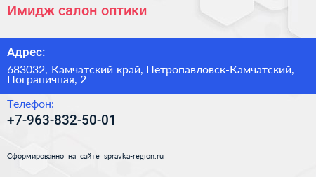 Имидж, салон оптики по адресу 683032, Камчатский край, Петропавловск-Камчатский, Пограничная, 2 в дальнейшем Организация, размещена в следующих категориях: