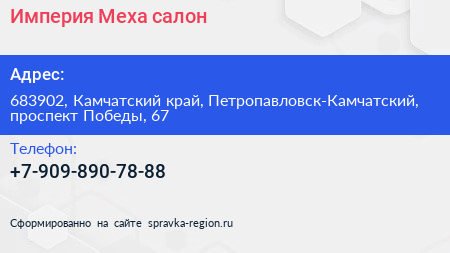 Империя Меха, салон по адресу 683902, Камчатский край, Петропавловск-Камчатский, проспект Победы, 67 в дальнейшем Организация, размещена в следующих категориях: