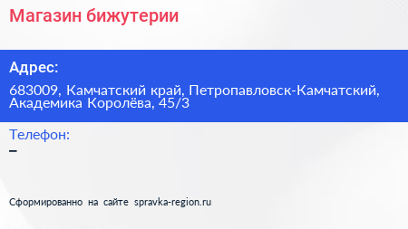 Магазин бижутерии по адресу 683009, Камчатский край, Петропавловск-Камчатский, Академика Королёва, 45/3 в дальнейшем Организация, размещена в следующих категориях: