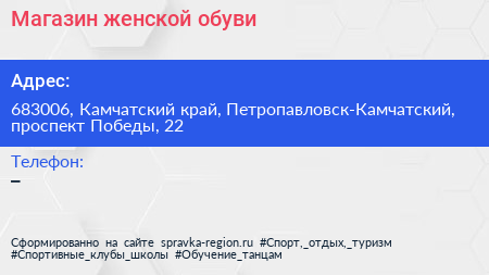 Магазин женской обуви по адресу 683006, Камчатский край, Петропавловск-Камчатский, проспект Победы, 22 в дальнейшем Организация, размещена в следующих категориях:
