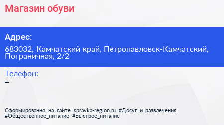 Магазин обуви по адресу 683032, Камчатский край, Петропавловск-Камчатский, Пограничная, 2/2 в дальнейшем Организация, размещена в следующих категориях: