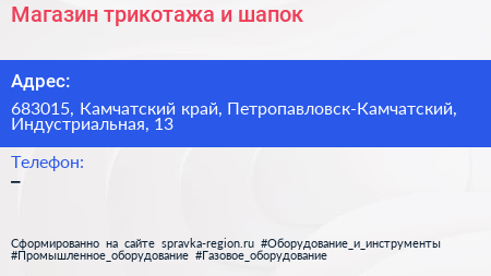 Магазин трикотажа и шапок по адресу 683015, Камчатский край, Петропавловск-Камчатский, Индустриальная, 13 в дальнейшем Организация, размещена в следующих категориях: