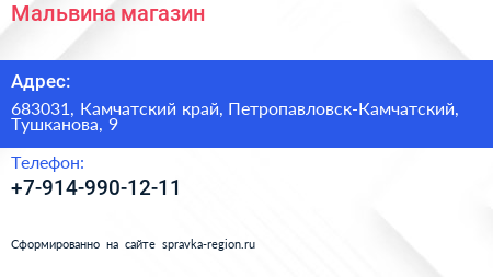 Мальвина, магазин по адресу 683031, Камчатский край, Петропавловск-Камчатский, Тушканова, 9 в дальнейшем Организация, размещена в следующих категориях: