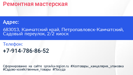 Ремонтная мастерская по адресу 683013, Камчатский край, Петропавловск-Камчатский, Садовый переулок, 2/2 киоск в дальнейшем Организация, размещена в следующих категориях: