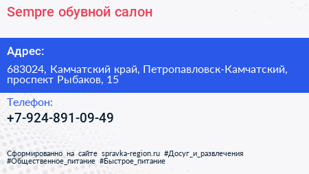 Sempre, обувной салон по адресу 683024, Камчатский край, Петропавловск-Камчатский, проспект Рыбаков, 15 в дальнейшем Организация, размещена в следующих категориях: