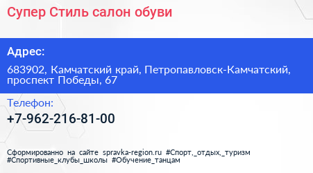 Супер Стиль, салон обуви по адресу 683902, Камчатский край, Петропавловск-Камчатский, проспект Победы, 67 в дальнейшем Организация, размещена в следующих категориях: