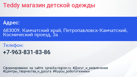 Teddy, магазин детской одежды по адресу 683009, Камчатский край, Петропавловск-Камчатский, Космический проезд, 3а в дальнейшем Организация, размещена в следующих категориях: