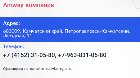 Amway, компания по адресу 683009, Камчатский край, Петропавловск-Камчатский, Звёздная, 11 в дальнейшем Организация, размещена в следующих категориях: