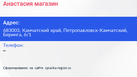 Анастасия, магазин по адресу 683003, Камчатский край, Петропавловск-Камчатский, Беринга, 6/1 в дальнейшем Организация, размещена в следующих категориях: