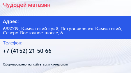 Чудодей, магазин по адресу 683009, Камчатский край, Петропавловск-Камчатский, Северо-Восточное шоссе, 6 в дальнейшем Организация, размещена в следующих категориях: