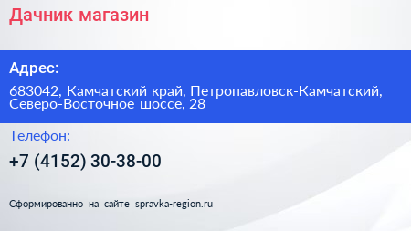 Дачник, магазин по адресу 683042, Камчатский край, Петропавловск-Камчатский, Северо-Восточное шоссе, 28 в дальнейшем Организация, размещена в следующих категориях:
