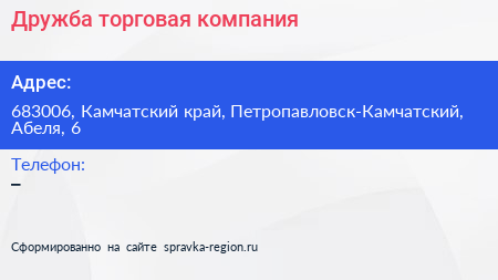 Дружба, торговая компания по адресу 683006, Камчатский край, Петропавловск-Камчатский, Абеля, 6 в дальнейшем Организация, размещена в следующих категориях: