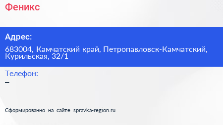 Феникс по адресу 683004, Камчатский край, Петропавловск-Камчатский, Курильская, 32/1 в дальнейшем Организация, размещена в следующих категориях: