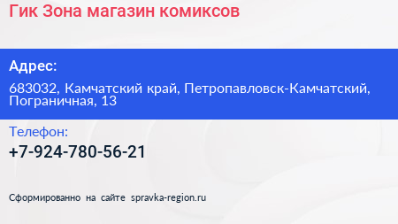 Гик Зона, магазин комиксов по адресу 683032, Камчатский край, Петропавловск-Камчатский, Пограничная, 13 в дальнейшем Организация, размещена в следующих категориях:
