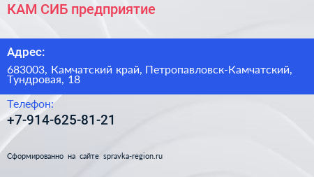 КАМ-СИБ, предприятие по адресу 683003, Камчатский край, Петропавловск-Камчатский, Тундровая, 18 в дальнейшем Организация, размещена в следующих категориях: