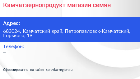 Камчатзернопродукт, магазин семян по адресу 683024, Камчатский край, Петропавловск-Камчатский, Горького, 19 в дальнейшем Организация, размещена в следующих категориях: