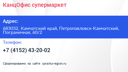 КанцОфис, супермаркет по адресу 683032, Камчатский край, Петропавловск-Камчатский, Пограничная, 60/2 в дальнейшем Организация, размещена в следующих категориях:
