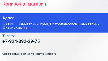 Копирочка, магазин по адресу 683013, Камчатский край, Петропавловск-Камчатский, Океанская, 98 в дальнейшем Организация, размещена в следующих категориях: