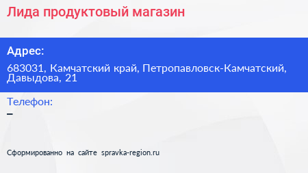 Лида, продуктовый магазин по адресу 683031, Камчатский край, Петропавловск-Камчатский, Давыдова, 21 в дальнейшем Организация, размещена в следующих категориях: