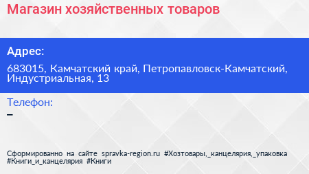 Магазин хозяйственных товаров по адресу 683015, Камчатский край, Петропавловск-Камчатский, Индустриальная, 13 в дальнейшем Организация, размещена в следующих категориях: