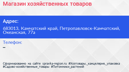 Магазин хозяйственных товаров по адресу 683013, Камчатский край, Петропавловск-Камчатский, Океанская, 77а в дальнейшем Организация, размещена в следующих категориях: