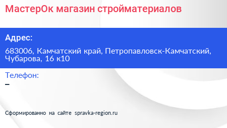 МастерОк, магазин стройматериалов по адресу 683006, Камчатский край, Петропавловск-Камчатский, Чубарова, 16 к10 в дальнейшем Организация, размещена в следующих категориях: