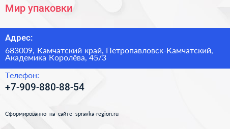 Мир упаковки по адресу 683009, Камчатский край, Петропавловск-Камчатский, Академика Королёва, 45/3 в дальнейшем Организация, размещена в следующих категориях:
