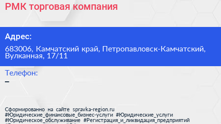 РМК, торговая компания по адресу 683006, Камчатский край, Петропавловск-Камчатский, Вулканная, 17/11 в дальнейшем Организация, размещена в следующих категориях: