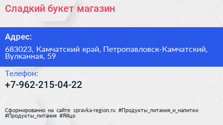 Сладкий букет, магазин по адресу 683023, Камчатский край, Петропавловск-Камчатский, Вулканная, 59 в дальнейшем Организация, размещена в следующих категориях: