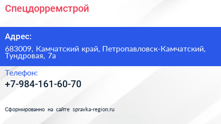 Спецдорремстрой по адресу 683009, Камчатский край, Петропавловск-Камчатский, Тундровая, 7а в дальнейшем Организация, размещена в следующих категориях: