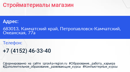 Стройматериалы, магазин по адресу 683013, Камчатский край, Петропавловск-Камчатский, Океанская, 77а в дальнейшем Организация, размещена в следующих категориях: