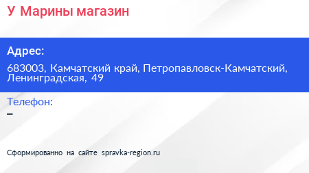 У Марины, магазин по адресу 683003, Камчатский край, Петропавловск-Камчатский, Ленинградская, 49 в дальнейшем Организация, размещена в следующих категориях: