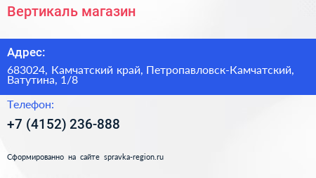 Вертикаль, магазин по адресу 683024, Камчатский край, Петропавловск-Камчатский, Ватутина, 1/8 в дальнейшем Организация, размещена в следующих категориях: